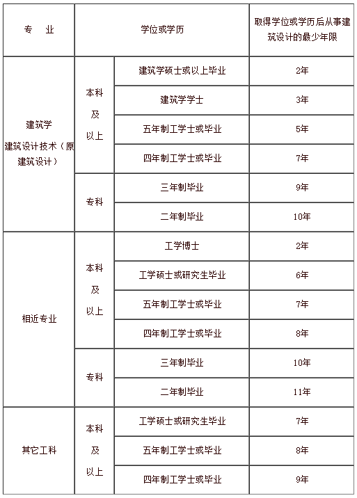 注:(1)根据《中华人民共和国注册建筑师条例实施细则》(中华人民共和国建设部令第167号)、《普通高等学校本科专业目录》(1998年版、2012年版)、《普通高等学校高职高专教育指导性专业目录》(2004年版)、《中等职业学校专业目录》(2010年版)等相关规定,“相近专业”:本科及以上为城乡规划(原城市规划)、土木工程(原建筑工程、原工业与民用建筑工程)、风景园林、环境设计(原环境艺术、原环境艺术设计);专科为城镇规划(原城乡规划)、建筑工程技术(原房屋建筑工程)、园林工程技术(原风景园林)、建筑装饰工程技术(原建筑装饰技术)、环境艺术设计(原环境艺术);中专为建筑装饰、建筑工程施工(原工业与民用建筑)、城镇建设、古建筑修缮与仿建(原古建筑营造与修缮)。