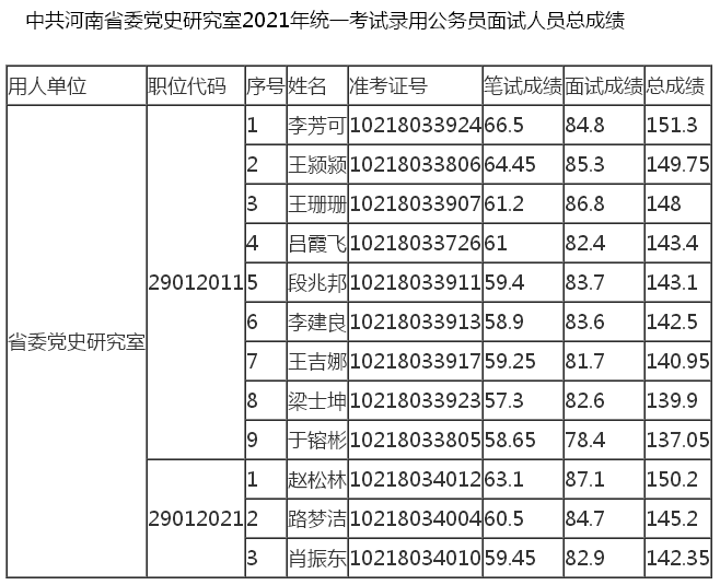 中共河南省委党史研究室2021年统一考试录用公务员考试总成绩公告